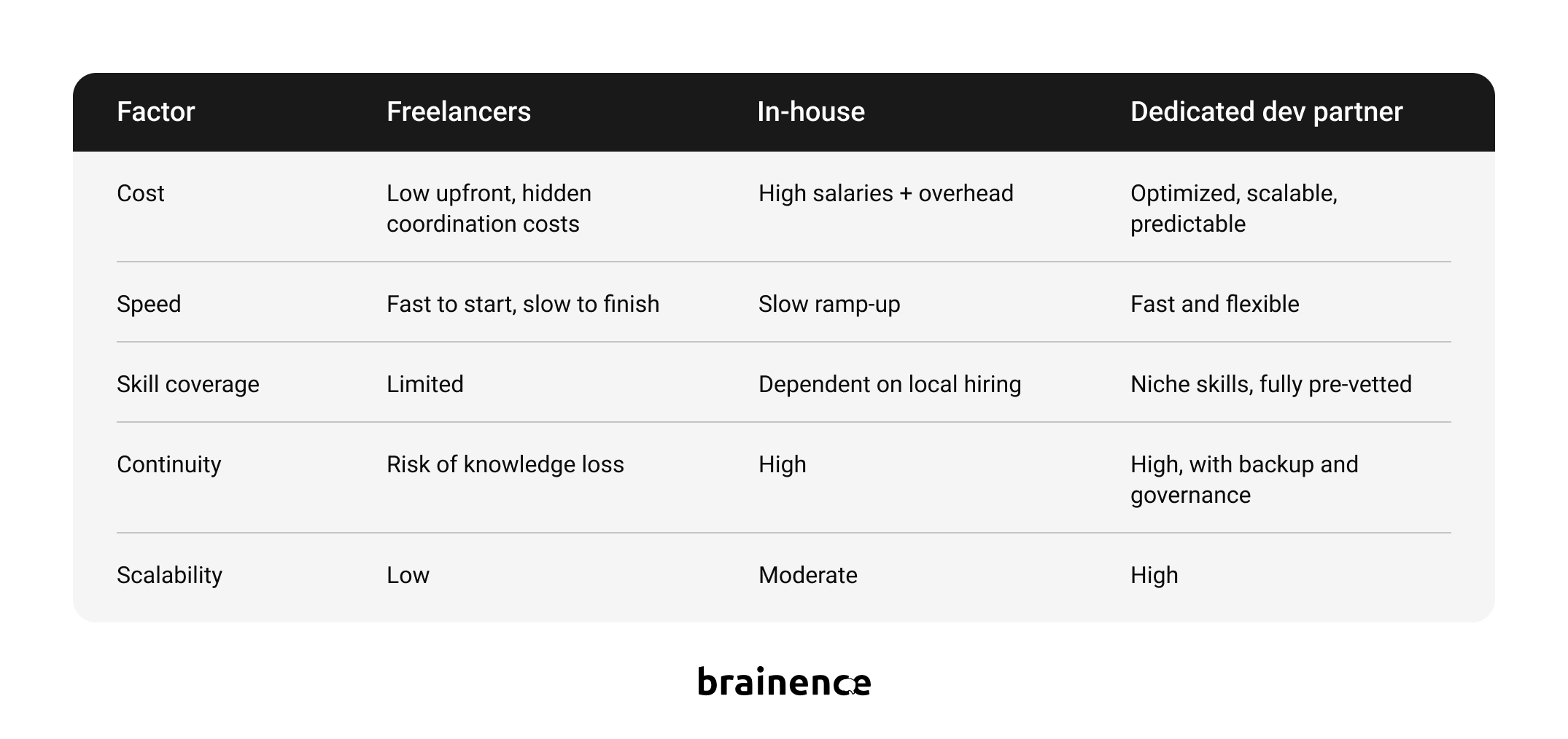 Freelancers are cheap and fast, but be aware: they may vanish when the going gets tough. In-house hires feel stable until salaries, benefits, and turnover sink your runway. And what about dedicated dev partners? They give you pre-vetted talent, flexibility, and continuity without the drama. Prioritize scope, skills, and timelines before spending a dime.